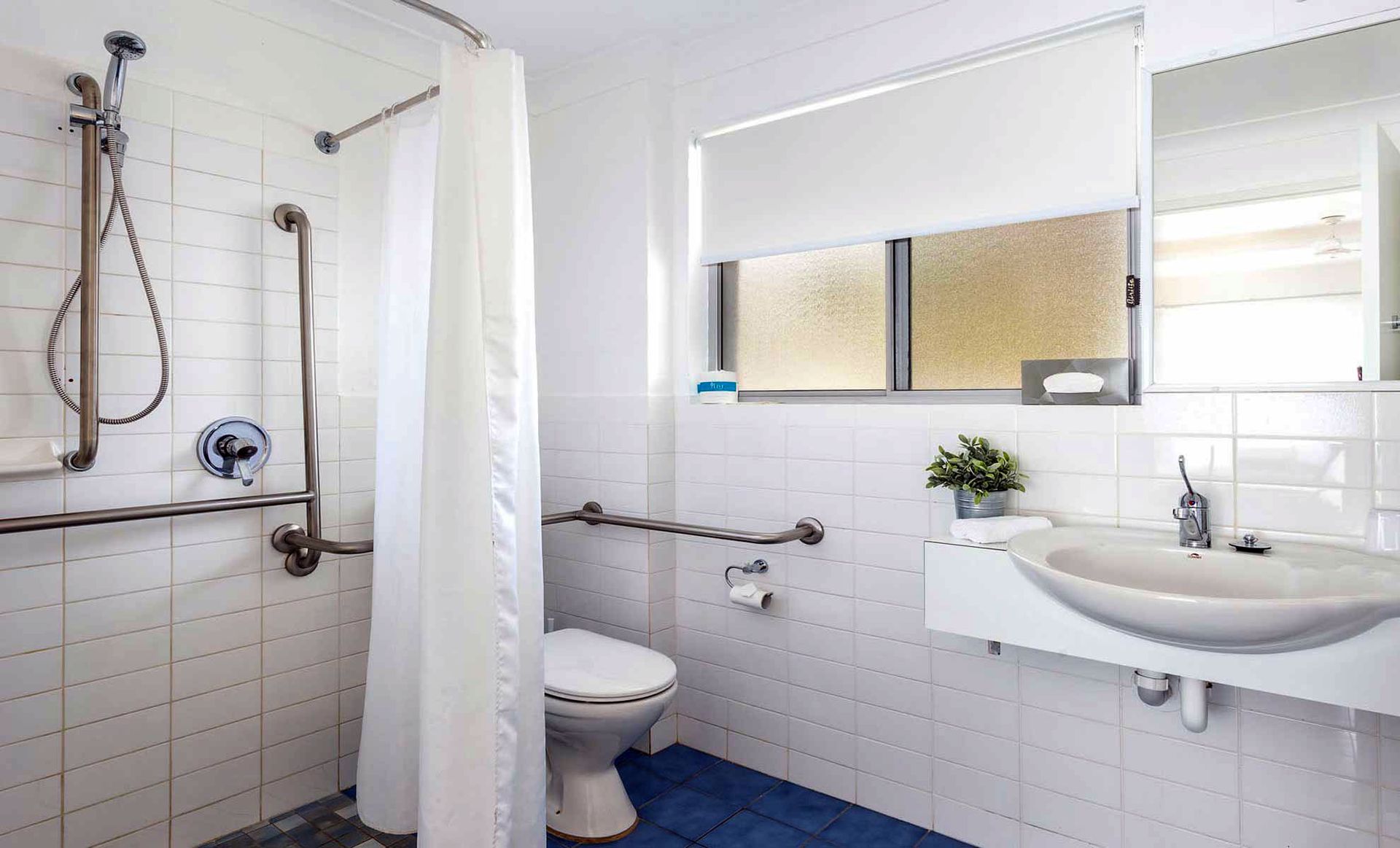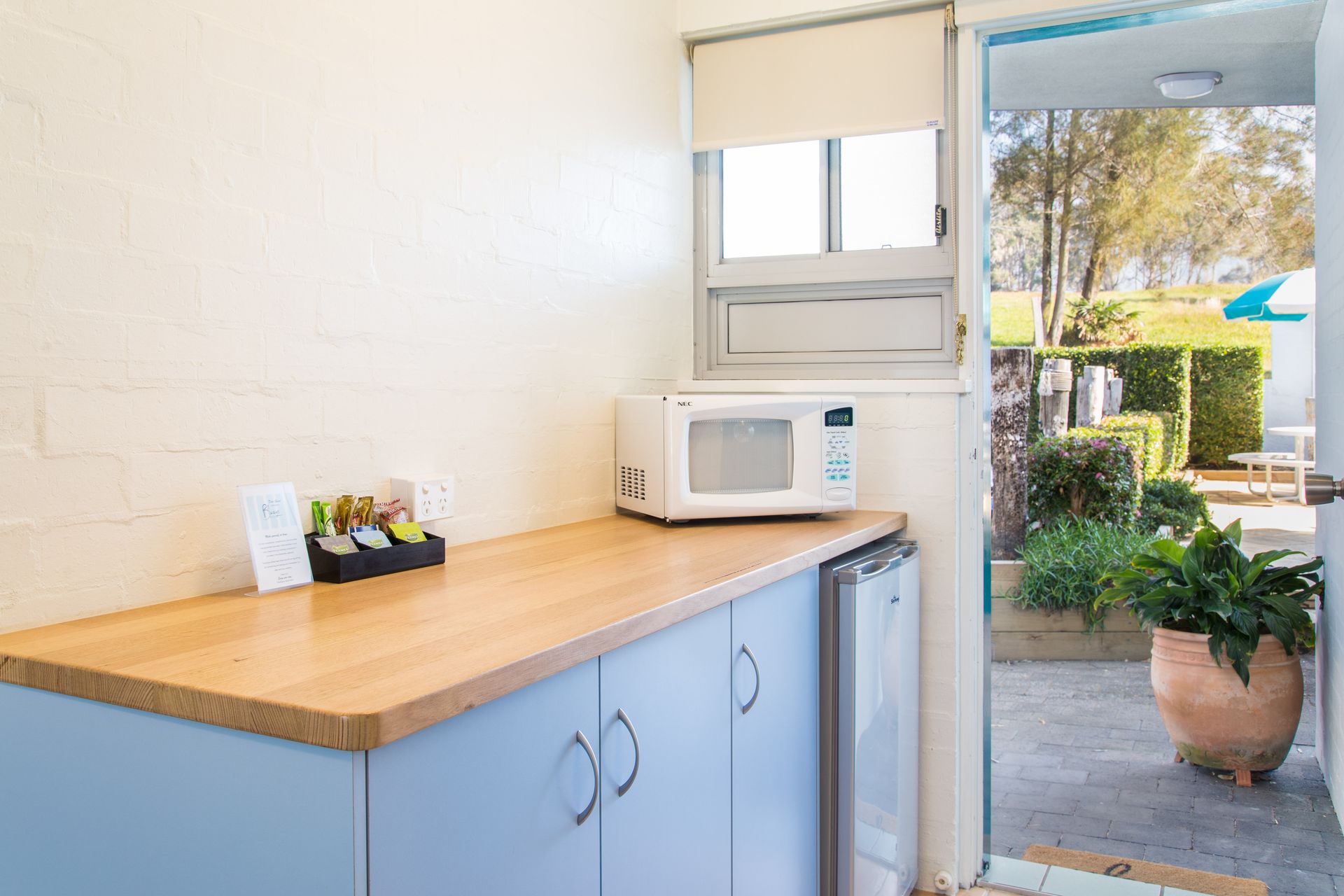 The Palms twin guest room presents fresh, white crisp sheets, super-comfy queen and double beds in a cosy feel-at-home room with a kitchenette, bathroom and outdoor patio setting next to pool and gardens - all just a short stroll to Blueys Beach, local shops and eateries with Boomerang Beach just over the hill.
