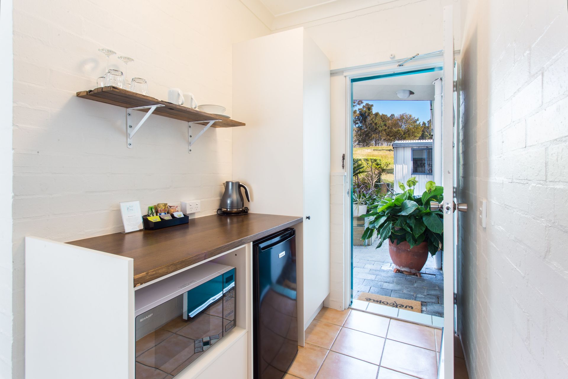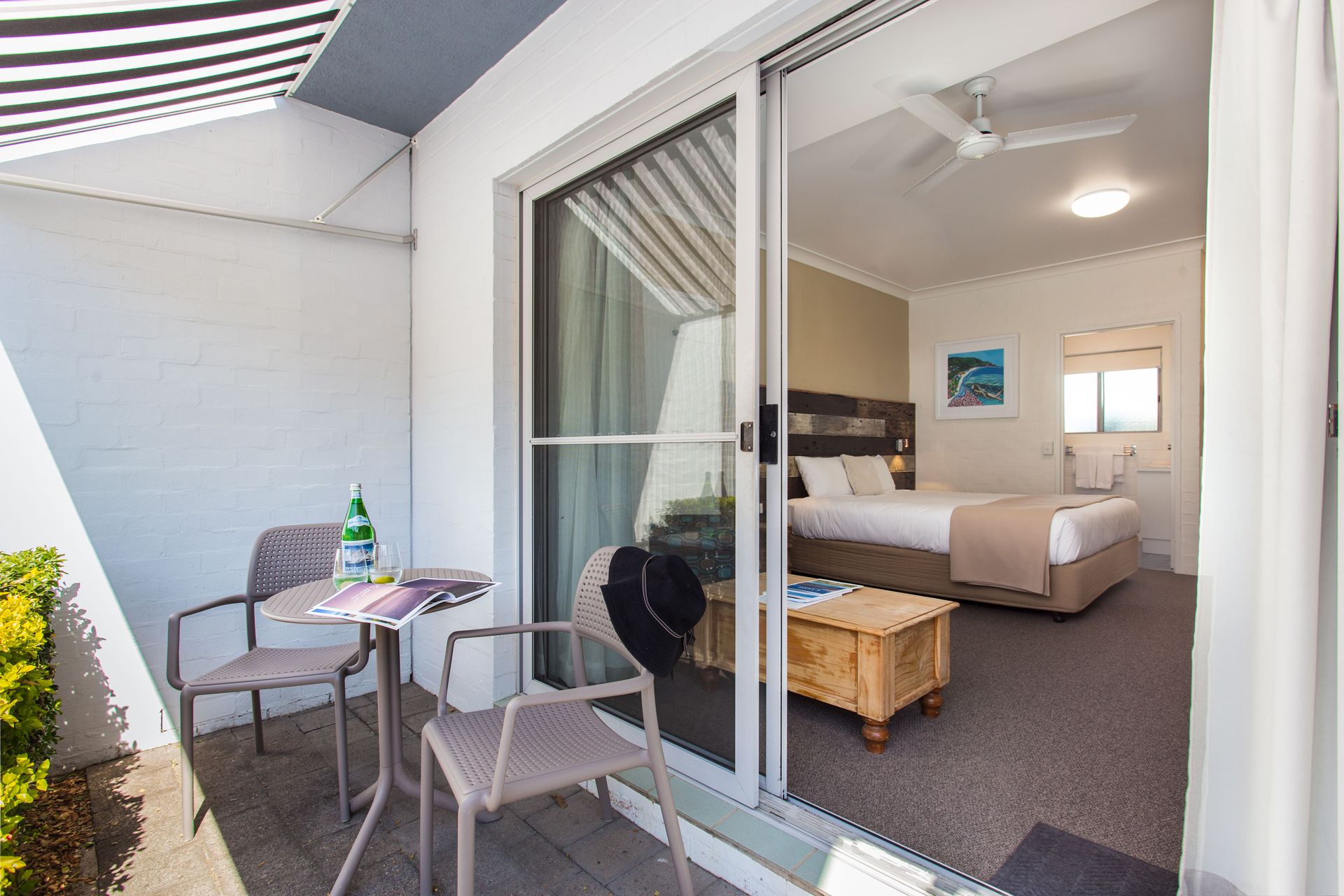 The Boomerang executive king guest room presents fresh, crisp white sheets, super-comfy king bed in a cosy feel-at-home room with furnishings, a kitchenette, mini-bar, bathroom and outdoor patio setting overlooking the pool and gardens - all just a short stroll to Blueys Beach, local shops and eateries with Boomerang Beach just over the hill. The Boomerang executive king room has the option to connect the adjoining Lizzie executive twin room.